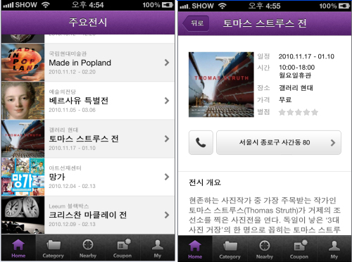 그동안 전시회를 찾기 위해선 일일이 전시회를 검색해야 하는 수고를 해야 했지만 아트데이 등 애플리케이션 하나만 있으면 손쉽게 국내에서 진행되고 있는 모든 전시회를 한 눈에 볼 수 있게 된 것. 게다가 미술전시 정보 이외에도 아트카페, 아트샵, 아트강좌 쿠폰코너도 마련, 미술에 관심있는 이들을 사로잡기도했다. 또 이용자들과의 상호작용을 통해 미술을 놀이처럼 즐길 수 있도록 한 점도 눈길을 끌고 있다. 자신이 본 전시에 댓글달기는 물론 평점주기를 통해 이용자들의 적극적인 참여를 유도하고 있다.