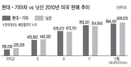 력을 보유한 현대ㆍ기아차가 급부상한 것. 경쟁업체들이 일제히 주춤했던 지난 2009년 현대ㆍ기아차는 홀로 판매량을 늘리며 미국 내 6위였던 토토사이트 토사장을 맹렬히 추격했다. 그 결과 2008년 28만대 가까웠던 두 회사의 격차는 2009년 3만5000대 수준으로 줄었고, 지난해에는 역전이 가시권에 들어왔다.