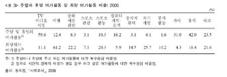 하지만 현실은 좀 달랐다. 조사대상자들에게 실제로 하고 있는 여가활동을 역시 복수로 물었더니 59.6%가 TV와 비디오 시청을 꼽았다. 42%는 휴식이라고 답했고, 31%는 여가시간에 가사활동을 하는 것으로 나타났다.