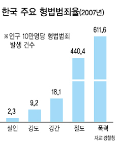각 국의 인구 10만명당 주요 형법 범죄의 발생건수(2007년 기준)를 살펴보면 우리나라는 1082건으로 조사대상국 중 가장 낮았다. 영국은 4961건, 미국이 3730건, 독일이 3829건 등 서구 선진국의 형법 범죄 발생건수가 아주 높았다. 한국은 살인, 강도, 강간 등 흉악범죄의 발생 비율도 낮았다. 살인은 2.3건으로 0.9건의 일본을 제외하고는 가장 낮았다. 강도 역시 9.2건에 불과해 프랑스(163), 영국(156) 등에 10분 1에도 못 미쳤다. 하지만 단순토토사이트 프리미어토토은 우리나라가 주요국을 앞섰다. 한국의 토토사이트 프리미어토토범죄 발생건수는 611.6건으로 미국(283.8), 영국(413.4), 프랑스(462.3) 등을 크게 웃돌았다.