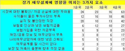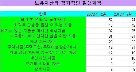 향후 6개월 이내에 가입을 고려하는 보험으로는 노후대비상품(18%)이 1위를 차지해 노후에 대한 관심은 여전히 높은 것으로 조사됐다. 하지만 현재 보유한 재산의 장기적인 활용계획에는 지난해 12월 실시한 동일 설문조사에 비해 13%가 감소한 44%의 응답자만이 ‘퇴직 후의 생활자금으로 쓰겠다’고 답한 반면 ‘퇴직 후 인생을 즐길 수 있는 자금으로 쓰겠다’는 응답자가 42%로 나타나 전년보다 많아졌다.