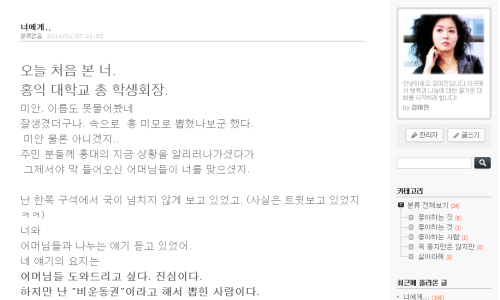 하지만 다시 학생을 생각하는 절절한 마음을 드러냈다. “‘악용’이라는 말을 쓰던데, 지금 네가 악용당하고 있다. 너의 뒤에 지금 누가 숨어 있는지, 보이니? 맘이 아팠다. 네가 자리를 뜬 후 목이 메더라. 그리고 많이 미안해졌다”면서 “ 힘들다. 이제 그만 그 짐 내려놓아라. 그리고 꼭 밥 한번 먹자”며 편지를 마쳤다.