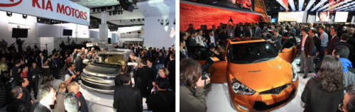 현대차는 올 디트로이트모터쇼 미디어데이에서 최고의 흥행을 거뒀다. 지난해 모터쇼에서 세계 최초 공개 차량이 없었음에도 평년작 이상의 수확을 올린 현대차는 올해 신개념차 ‘벨로스터’와 소형 컨셉트카 ‘커브’를 앞세워 ‘대박’을 터뜨렸다.