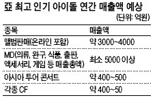 지난해 동방신기를 누르고 일본 내 연간 음반판매 1위를 차지한 것은 일본의 남성그룹 아라시로 약 2370억원의 매출을 기록했다. 이를 현재 일본 시장에서 일개 가수나 그룹이 올릴 수 있는 최대 음반매출이라고 한다면 한류 스타도 2000억원 이상의 수입이 얼마든지 가능하다는 얘기다. 여기에 온라인 음원 판매와 중국어권, 동남아권 시장에서의 음반ㆍ음원 매출까지 더한다면 해외에서 3000억~4000억원까지 벌어들일 수 있다. 음악계에 따르면, 한 개 팀이 아시아 공연 투어로 올릴 수 있는 매출은 연간 최대 500억원. 아이돌 그룹을 브랜드로 한 화보, 팬시상품, 티셔츠, 화장품 등 머천다이즈(MD)의 매출과 음악 외 영화, 드라마 출연을 통한 부가수익까지 더한다면, 20억원을 들여 키운 아이돌 그룹이 성공적으로 해외시장에 데뷔할 경우 연간 1조원 이상을 벌어들이게 된다.