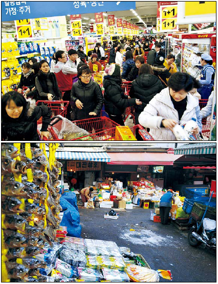 ▶백화점 대형마트 웃고 골목상권 울고=18일 오후 서울 중구 명동 패션거리는 한산했다. 대여섯 발자국 띨 때마다 어깨가 부딪힐 정도로 쇼핑객이 붐볐던 거리가 영하 10도 아래로 내려간 강추위 속에 종종걸음을 치는 몇몇만 눈에 띌 정도로 썰렁했다.