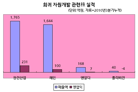 한 증권업계 전문가는 “실적이 베이스된 기업은 테마가 시들할 때 하락폭을 어느 정도 예측할 수 있지만, 적자 기업은 예측할 수 없다”며 “자원개발주 중 제대로된 실적을 보여주는 기업이 없다는 점을 항상 염두에 두고 투자를 감행해야 할 것”이라고 조언했다.