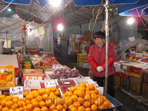 그나마 설 대목 분위기가 느껴질 만한 과일가게도 썰렁하기 그지없었다. 시장 초입에서 과일장사를 하는 손모(67ㆍ여) 씨는 “추워서 다 인근 대형 마트로 갔는지, 아직 선물세트 찾는 손님이 많지 않다”며 한쪽에 쌓여 있는 사과, 배 선물세트를 보며 한숨지었다. 손 씨는 “인근에 타임스퀘어가 들어온 뒤로 교통체증이 심해져 시장 오는 사람은 더 줄었다”면서 “말 그대로 재래시장은 ‘죽어라 죽어라’ 하는 상황”이라며 말을 잇지 못했다.