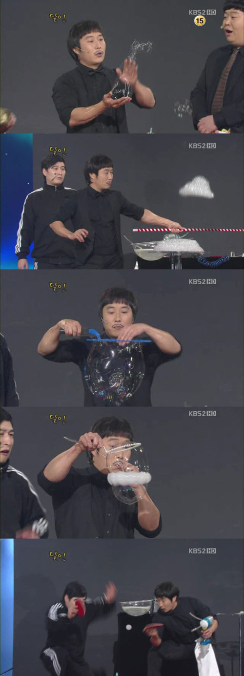 화산 안에서 부글부글 끓는 용암이 분출되는 듯한 비눗방울 화산을 만들며 상상력의 한계가 어디인지를 궁금하게 만들더니 비타임 토토 물레방아까지 만들었다. 그 비눗방울 물레방아는 그가 입김을 불자 도르르 돌아가며 방청석의 탄성을 자아냈다. 김병만의 비눗방울 개그는 종국엔 비타임 토토 탁구까지 치는 상황까지 연출하며 ‘달인’다운 무대를 꾸몄다.