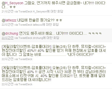 뮤지컬 ‘아이다’ 제작사 신시컴퍼니는 게릴라 할인 이벤트를 트위터를 통해 알렸다. 현장 잔여석에 한해 40% 할인을 해준다는 것이다. 단, 이 할인을 받기 위해서는 트위터를 통해 공개되는 암호를 대야 한다. 암호명은 ‘나는 아이다다’. 트위터 암호 공지에 팔로워들은 “본인은 물론 티켓박스 직원도 좀 민망하겠다”란 반응도 있었지만 “그래도 40% 할인이 어디냐”며 관심을 보였다.