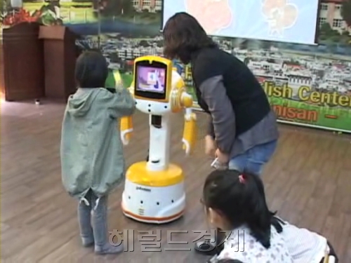 21일 오전 10시 경기도 안양시 호원초등학교 영어체험센터에서 열린 외국어교육 토토사이트 토사장 ‘로보샘’ 공개수업 현장의 모습이다. 토토사이트 토사장이라는 첨단기술을 교육 현장에 접목해 학습 효과를 높인다는 취지로 진행된 교육 실험의 일환이다.