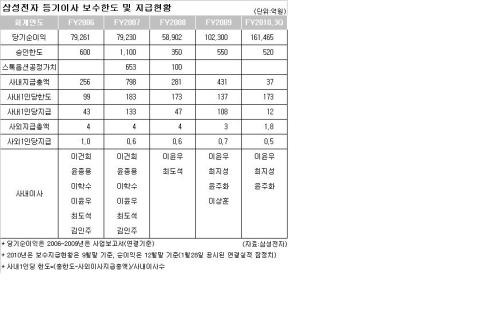 한편, 삼성전자가 22일 공시한 정기주총 이사보수한도액은 일반보수 220억원, 장기성과금 150억원 등 370억원이다. 지난해 일반보수 220억원, 장기성과금 300억원과 비교하면 성과보수만 깎인 셈이다. 장기성과금은 2005년 폐지된 스토옵션을 대체하는 제도로 각 연도별 사업성과에 대한 보상을 3년간 나눠서(1년차 50%, 2년ㆍ3년차 각 25%씩) 지급하는 방식이다. 따라서 보수한도로만 따지면 등기임원의 보수가 크게 줄었다고 단정짓기는 어렵다.