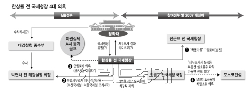 두 정권에 걸쳐 국세청장을 지냈던 그에게 숱한 의혹이 제기된 가운데, 이들 의혹은 정권 갈아타기 과정과 맞물리면서 묘하게 얽혀 있는 듯하다. 정권 교체기 그의 행보 속에 의혹의 본질이 숨어 있다는 관측이다.
