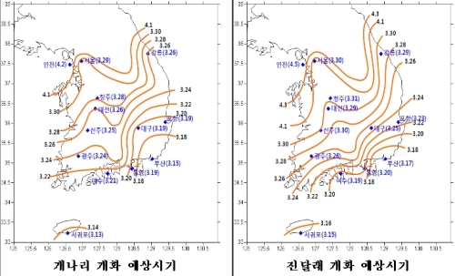 개나리도 3월13일 제주도 서귀포를 시작으로 남부지방에서는 3월15~26일, 중부지방에서는 3월27~4월1일, 경기북부와 강원북부는 4월2일 이후 각각 개화할 것으로예상된다.