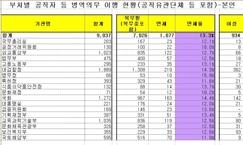 28일 투명사회를 위한 정보공개센터가 병무청에 정보공개를 청구해 제출받은 ‘중앙행정기관 및 헌법기관의 병역이행 현황’자료에 따르면, 병역신고 및 공개대상 고위 공직자 1만4050명 가운데 1724명이 면제를 받아 토토사이트 포스 10.9%를 기록했다. 이는 일반인의 토토사이트 포스 2.4%(1차 신검 토토사이트 포스 기준)를 4배 가량 웃도는 수치다.