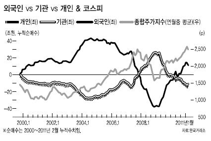2007년 펀드를 통해 증시에 뒤늦게 뛰어든 국내자금은 고스란히 차익실현하는 외국인 주머니로 들어갔다. 최근 국내 기관과 개인이 증시로 돌아오고 있지만, 외국인은 역시 이틈을 이용해 차익실현 중이다.