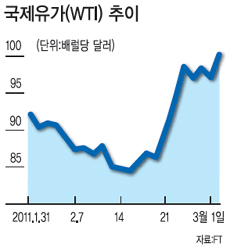 1일(현지시간) 미국 뉴욕상업거래소(NYMEX)에서 4월 인도분 서부 텍사스산 중질유(토토사이트 실수)는 전날보다 2.66달러(2.7%) 상승한 배럴당 99.63달러로 거래를 마쳤다. 종가 기준으로 지난 2008년 9월 이래 가장 높은 수준이다.