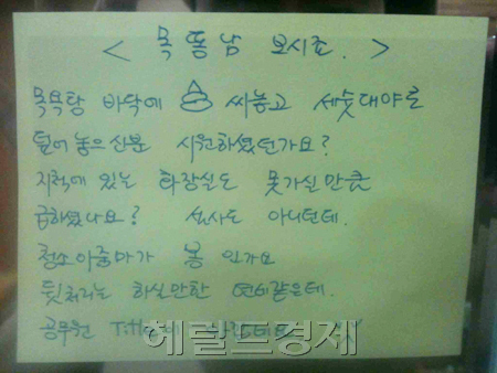 메모지 내용인즉 "목욕탕 바닥에 (중략) 세숫대야로 덮어 놓으신 분 시원하셨던가요? 지척에 있는 화장실도…(중략) 청소아줌마가 봉 인가요. 뒷처리는 하실만한 연세같은데. 공무원 타이틀이 아깝네요" 라고 적혀 있었다.