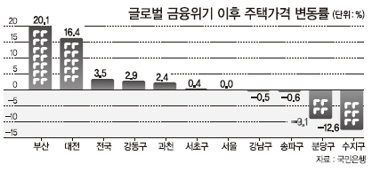 2003~2006년 수도권 토토사이트 번호 차단 폭등기에 찬밥 신세였던 부산과 대전 등 지방 광역시들은 화려한 백조로 변신했다. 글로벌금융위기 이후 2년 5개월동안 부산 사상구 토토사이트 번호 차단이 35% 급등한 것을 비롯해 북구(34%), 사하구(25.1%), 해운대구(23.6%) 등 부산지역 주택시장이 후끈 달아올랐다.