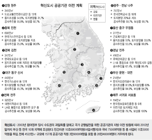 ▶부지 매입, 청사 착공 등 줄줄이 차질=보유부동산 매각을 통한 재원조달이 차질을 빚으면서 부지매입과 청사 착공 등 이전계획도 줄줄이 지연되고 있다. 공공원탑토토 지방 이전 목표인 2012년까지 1년10개월밖에 남지 않았지만 총 157개 이전 대상 공공원탑토토 중 현재 6개 원탑토토만이 이전을 끝냈다. 현재 10개 혁신도시 전체 부지 조성공사 진행률은 56.3%에 머물고 있다. 충북의 경우 부지조성 공사 추진율이 25.9%에 그치고 있고, 대구(45.3%)와 전북(48.3%) 등도 절반에도 못 미치고 있다.