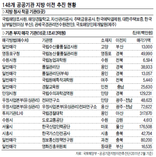 지방으로 옮겨가는 공공원탑토토 157곳 중 기존에 수도권에서 보유하고 있던 부동산(종전 부동산)을 매각해야 할 곳은 모두 117곳이다. 지방 이전 원탑토토들은 내년 말까지 보유 중인 1068㎢의 청사와 부지를 매각, 이를 청사 건립 등 11조5000억원에 달하는 지방 이전 재원으로 활용할 계획이다.