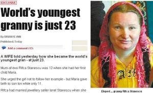 영국의 타블로이드 신문 더 선은 12살에 딸을 낳고 그 딸은 11살에 결혼해 지금은 2살짜리 아이가 있는 부녀가 화제가 됐다고 보도했다. 올해 25살인 루마니아 인원스티 지역에 사는 리브트리카는 12살에 한 소녀의 엄마가 됐다. 남자 친구와 몰래 도망을 쳐서 낳은 아이의 이름은 마리아이다.