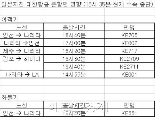 대한항공 측은 11일 “일본 지진여파로 나리타 및 하네다 공항이 폐쇄 조치됨에 따라 오늘 오후 4시35분부터 이 노선 탑승 수속을 사이다토토했다”고 밝혔다.