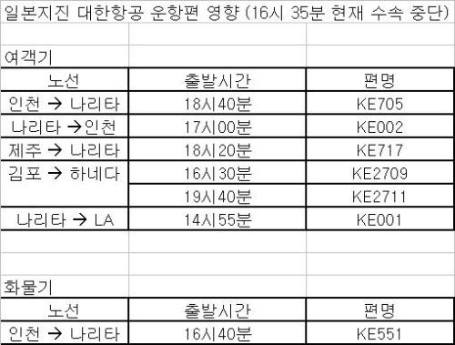 또 일본 나리타 공항에서 오후 14시55분 미국 로스앤젤레스로 향하는 KE001편도 결항됐다.
