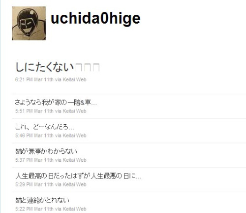 “죽는 줄 알았다”는 문장으로 그는 트윗을 시작했다. “우리집은 신축이라 무사했습니다. 쓰나미 오지마라. 아버지가 휠체어를 타고 계셔서 피난이 불가능한 것은 아닌지. 정전, 수도도 나오지 않는다. 부모님이 무사해서 다행이다”면서 다급한 상황 속에서도 이내 평정을 찾았다. 이 때까지는 그러했다. 쓰나미가 오고 나니 목소리는 더 다급해지기 시작했다. 그리고 ’죽는 줄 알았다’던 문장은 이내 ’죽고싶지 않다’는 절규로 이어지게 됐다.
