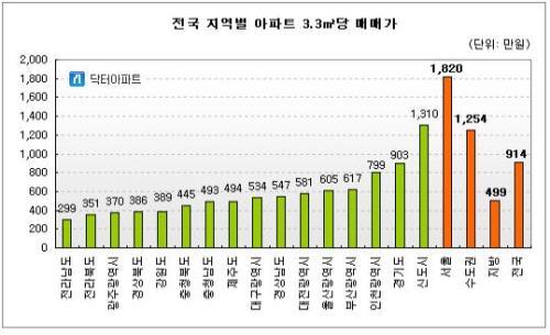 지난 22일현재 npb 토토사이트 아파트 평균 3.3㎡당 매매가는 1천8백20만원, 지방 5대광역시와 중소도시를 합한 지방 평균은 4백99만원이다.