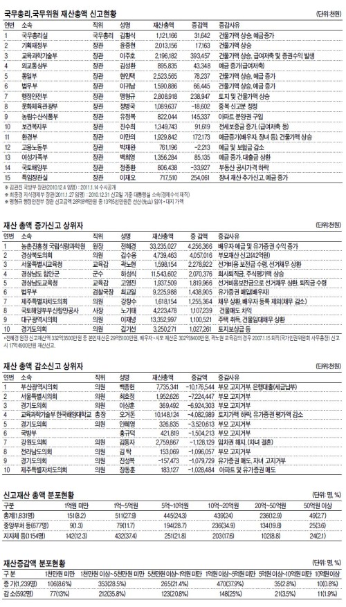특히 서울 강남지역에 아파트 등 토토사이트 사라짐을 보유한 공직자들은 재산이 수억원씩 늘어나는 ‘기쁨’을 누렸다. 진병화 기술신보 이사장은 서울 반포 래미안 아파트의 가치가 8억여원 상승해 20억4000만원에 달하면서 재산 증가 상위권에 들었다. 대통령실 소속 고위 공직자 중 1억원 이상 재산이 늘어난 경우도 대부분 건물가액 상승이 이유였다. 백용호 정책실장은 반포동 아파트와 개포동 주공아파트의 평가액이 4억원 늘었다.