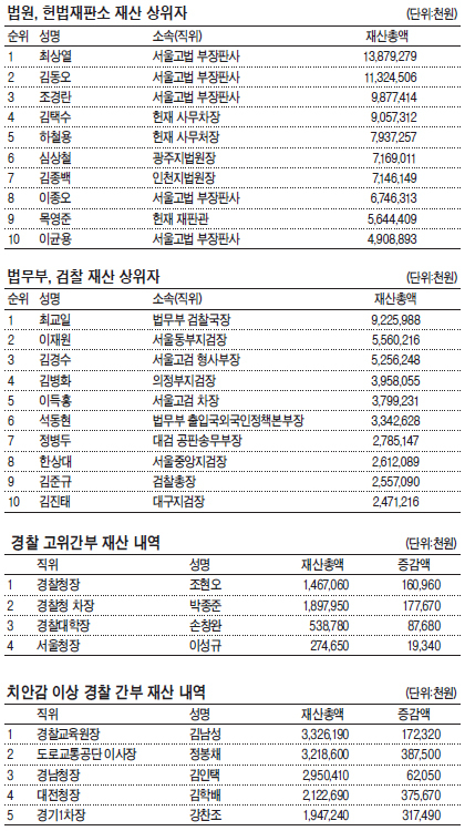 법원 내 최고부자는 최상열 서울고법 부장판사로 조사됐다. 자산총액이 138억7900여만원이다. 서울 강남구 신사동의 건물과 성동구 옥수동의 아파트 등을 증여받아 단박에 60억원 이상 불었다. 최 부장판사의 급부상으로 줄곧 법원 내 최고 재력가로 알려졌던 김동오 서울고법 부장판사(113억2400여만원)는 2위로 밀려났다.