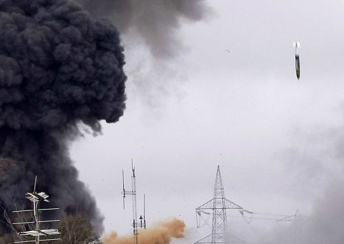 나토 연합군이 29일 리비아 수도 트리폴리와 인근 타주라에 미사일(점선 원) 공습을 가하고 있다. 삼엄한 경비가 펼쳐지고 있는 무아마르 카다피 국가원수관저와 군사시설 인근에도 미사일이 떨어져 거대한 폭발음과 연기가 솟아났다.