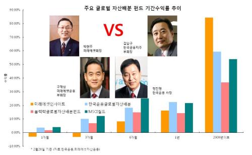 양 펀드의 수익률에서는 최근 1년 이내는 한국운용(실제 수익률이 아닌 시뮬레이션 수익률)이, 1년 이상에서는 미래에셋이 다소 우위다.