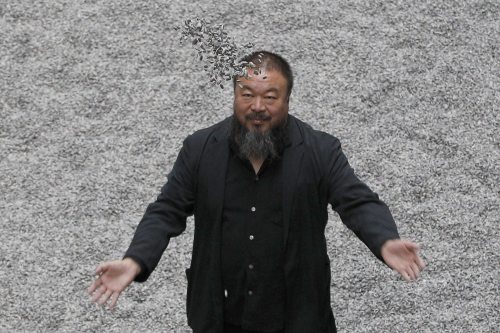 중국의 세계적인 설치미술가인 아이 웨이웨이가 지난해 10월 11일 런던 테이트 모던 갤러리에서 도자기로 만든 1억개가 넘는‘ 해바라기 씨’라는 작품을 배경으로 씨를 뿌리고 있다.‘ 냐오차오(鳥巢ㆍ새둥지)’로 불리는 베이징올림픽 주경기장을 공동설계한 그는 스포츠토토 풍자 퍼포먼스를 계획하고 있었으나 3일 베이징 공항에서 경찰에 구금됐다.