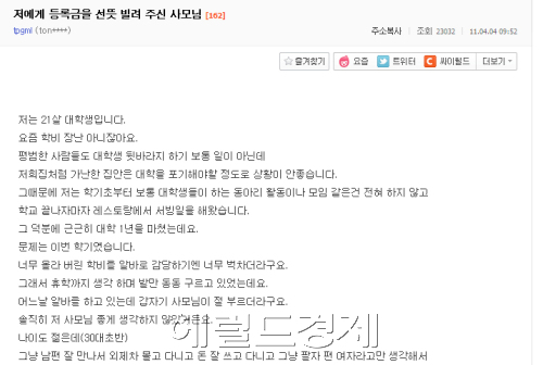 나날이 치솟는 등록금 때문에 대학 캠퍼스는 여전히 꽁꽁 얼어붙어있다. 이러한 분위기에서 아르바이트생에게 한 학기 등록금을 선뜻 빌려준 토토사이트 공지 주인의 사연이 인터넷을 훈훈하게 달구고 있다.