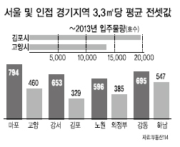또 고양시의 3.3㎡당 평균 전셋값은 460만원으로 맞붙어 있는 마포ㆍ은평에 비해 최고 40% 이상 싼 것으로 나타났다.