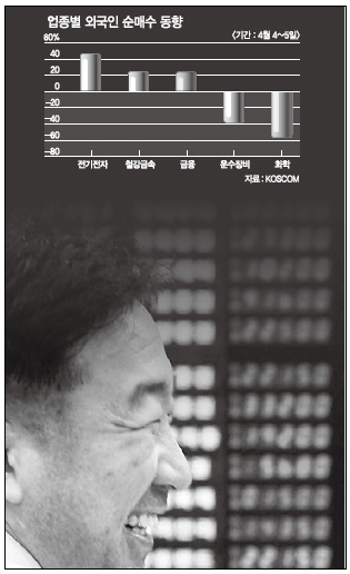 반면 대만은 6억 달러가 순유출됐고, 중국은 순유입액이 소폭에 그쳤다. 최근 국내 증시에서 강도높은 외국인의 ‘사자’ 행진은 이런 배경에서다. 국내 증시에서 지난 5일까지 유가증권 시장에서 15거래일 연속 순매수 행진을 하며 4조원 넘게 주식을 사들였다. 지난 연말 이후 가장 강한 매수세다.