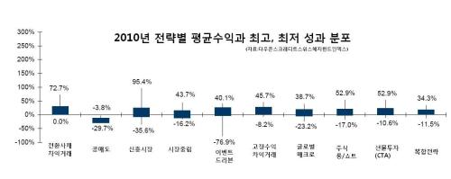전략별 장단점과 시장상황에 대한 분석이 끝나면 전통자산과의 분산효과를 높일 수 있는 헤지토토사이트 악성코드 포트폴리오와 비중을 택할 수 있다. 전략간 상관관계는 표를 참조하면 된다. 숫자가 낮을 수록 분산효과가 크다는 뜻이다.