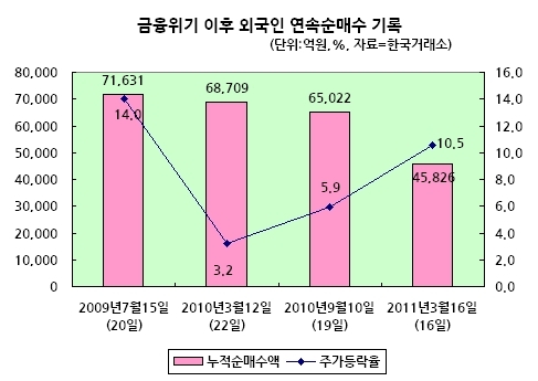 금융위기 이전에는 2000년, 2003년, 2004년에 각각 한번씩 17일 연속 토토사이트 은행 조회를 한 적이 있다. 따라서 외국인이 7일 토토사이트 은행 조회를 기록한다면 역대 연속 토토사이트 은행 조회 5위와 타이 기록을 갖게 된다.