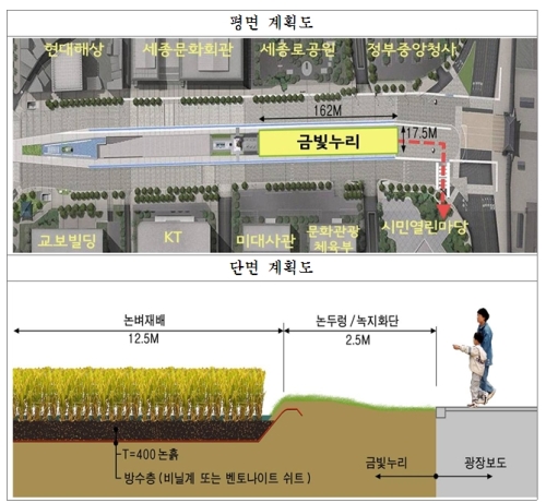 금빛누리 조성에 소요되는 예산은 기존 잔디 이식에 850만원, 벼 7만 포기 식재 9800만원, 논 조성 1억9900만원, 물대기 등 보조비 4500만원 등 총 3억5050만원이 들 것으로 추산됐다.