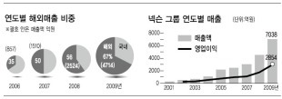 일찌감치 해외 진출을 시도한 넥슨은 현재 미국ㆍ일본ㆍ중국 등 72개국에 진출해 있다. 해외 매출을 처음으로 별도 집계한 2006년 35%였던 글로벌 매출 비중은 2009년 기준으로 67%까지 급증했다. ▶독특한 지배구조, 日 증시 상장이 화두=넥슨은 김정주 NXC 회장이 1994년 창립했다. NXC는 넥슨에서 분리된 지주회사로 넥슨의 지배구조 정점에 있는 회사다. 2009년 연결 감사보고서 기준으로 김 회장이 47.49% 지분을, 공동 창업자인 부인 유정현 이사가 20.71% 지분을 보유 중이다.