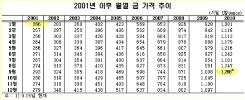 금값이 연거푸 사상 토토사이트 토사장치를 신기록 행진을 이어가자 지난해 10월 “금값이 폭락할 수도 있다”는 한국은행의 전망이 또 무색하게 됐다. 더구나 한국은행에 따르면, 국제 금값은 지난 2001년부터 10년 간 무려 6배나 올랐지만 한은의 금 매입량은 저조한 실정이다.