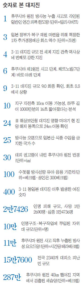 일본 동북부를 강타한 ‘동일본 대지진’이 발생한 지 한 달이 됐지만 아직도 재앙은 끝나지 않았다. 3ㆍ11 대지진과 쓰나미는 태평양 연안 3개 현(미야기, 이와테, 후쿠시마)을 초토화시키면서 2만7000여명이라는 인명피해를 냈다. 7일 현재 공식 집계된 사망자 수는 1만2690명ㆍ실종자 수는 1만4736명에 이른다. 20만명에 가까운 피난민들은 아직도 비좁은 대피소에서 물자부족에 허덕이고 있다.