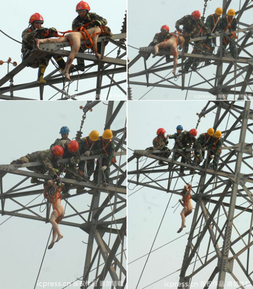 때 마침 우연히 그녀를 발견한 사람이 경찰과 119에 신고를 했다. 결국 구조대와 경찰, 의사 등이 고압 전선탑 아래 모여 들었지만, 그녀는 내려올 생각을 하지 않아 구조를 하게 됐다.