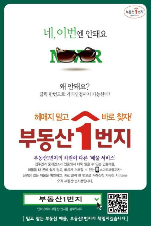 ‘네...이번엔 안되요!’라는 카피로 진행 중인 비교 광고는 네이버의 확인매물 서비스에 대응한 대가 토토사이트1번지의 특화된 매물 서비스를 홍보하는 내용이다. 네이버의 확인매물 서비스는 온라인에 올라온 매물 서비스를 검색한 뒤, 서비스 이용자가 직접 중개업소에 전화를 거는 불편이 있다.