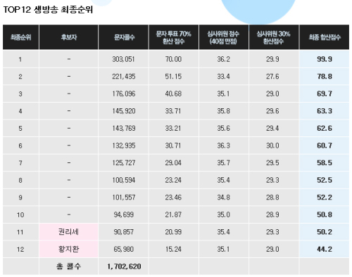 결과에 따르면 30만3051표의 문자콜과 36.2점의 심사위원 점수를 받은 백청강이 1위였다. 2위는 심사위원 평가에서 33.4점으로 최하위를 기록했던 손진영이었다. 그는 문자콜에서 22만1435표를 얻어 백청강에 이어 2위를 차지했다.