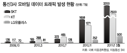 통신3사에 따르면 지난 3월 현재 SK텔레콤의 피처폰과 스마트폰을 합한 총 데이터 트래픽은 3200TB, KT는 2500TB, LG유플러스는 500TB로 집계됐으며 이 수치는 매달 꾸준히 증가하고 있다.