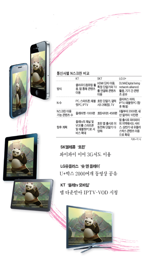 통신사들의 ‘엔(N)콜로세움 토토 서비스가 빠르게 진화하고 있다. N-스크린은 TV, 스마트폰, 태블릿PC 등 다양한 기기에서 콘텐츠를 끊김 없이 이어볼 수 있는 ‘원 소스 멀티 유스(OSMUㆍOne Source Multi Use)’의 개념이 적용된 서비스다. N은 기기의 수를 뜻한다. SK텔레콤, LG유플러스, KT 등 통신사들은 서로 다른 기술을 앞세워 N-스크린 서비스 시장의 주도권 확보에 나서고 있다.