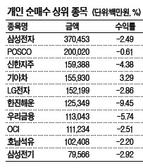 오히려 개인 순매도 상위 10개 종목인 삼성중공업 삼성SDI SK이노베이션 삼성물산 제일모직 대우조선해양 LG 대우인터내셔널 현대모비스 현대건설 등은 평균 8.06%의 수익률을 냈다.