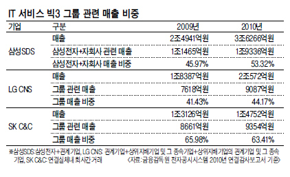 업계 ‘빅3’는 아니지만 최근 논란이 됐던 현대오토에버의 경우엔 현대차그룹 관련 매출 비중이 2009년 82.66%, 2010년 95.34%에 이른다. 게다가 삼성SDS(지분율: 이재용 8.81%, 이부진 4.18%, 이서현 4.18%), SK C&C(최태원 44.5%, 최기원 10.5%) 등 주요 업체엔 오너 일가가 주요주주로 등재돼 있다.